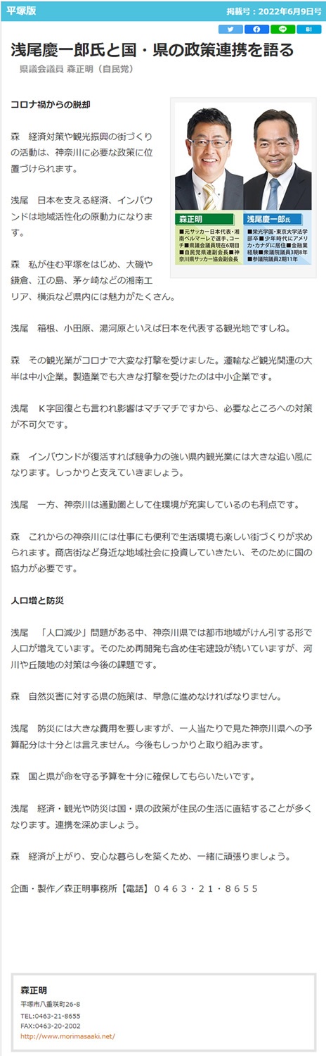 「タウンニュース平塚版/2022年6月9日号」にて 、県政報告が掲載されました。